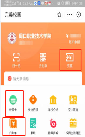 1、在线充值:在“完美校园”完成校园卡认证后,点击“充值”,可以完成校园卡在线充值。